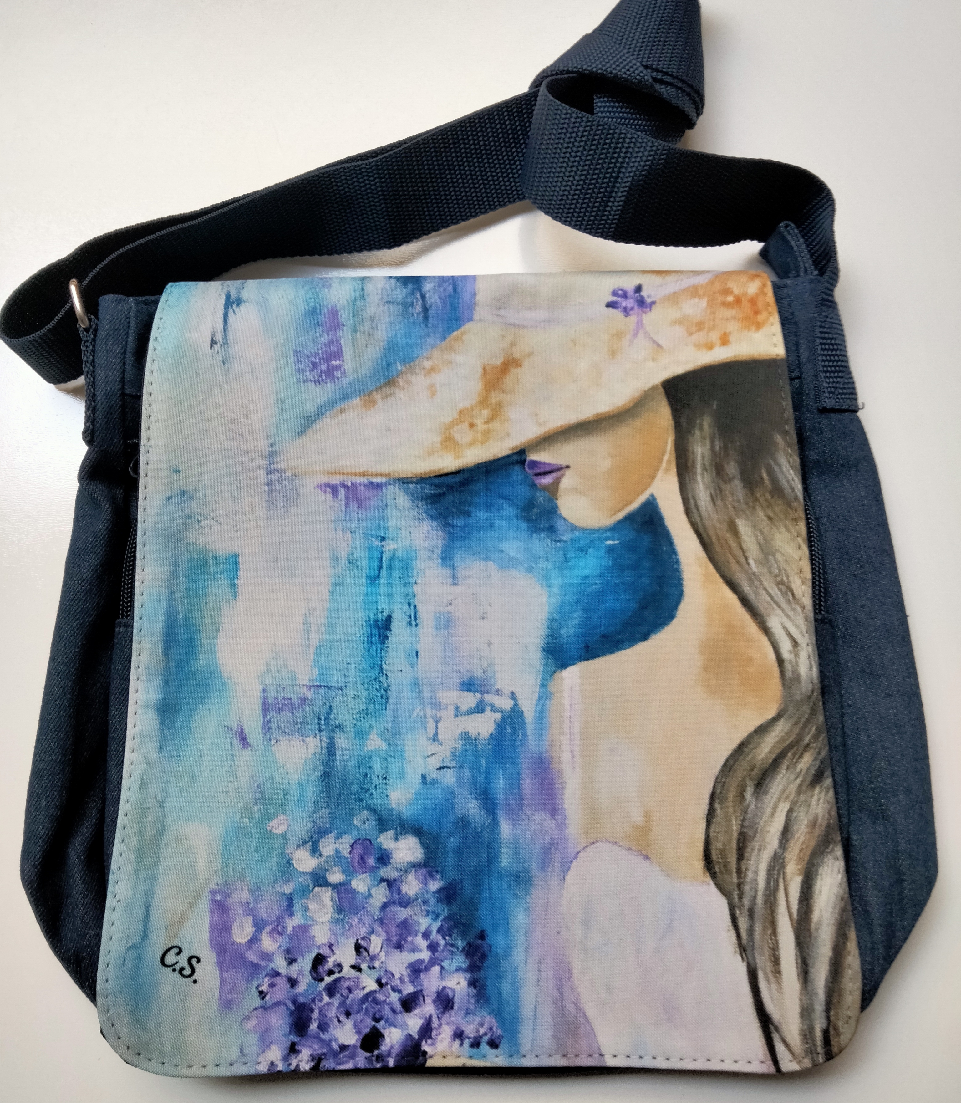 Überschlagtasche mit einem Motiv eines von Claudia Solbach gemalten Bildes. Der bedruckte Überschlag ist vorn und hinten an der Tasche mit Klettverschluss befestigt und kann abgenommen werden. Die Tasche hat zwei Frontaschen mit Reißverschluss, eine Innentasche mit Reißverschluss und eine Handy-Innentasche. Der Tragegurt ist verstellbar bis max. 94 cm Länge.
