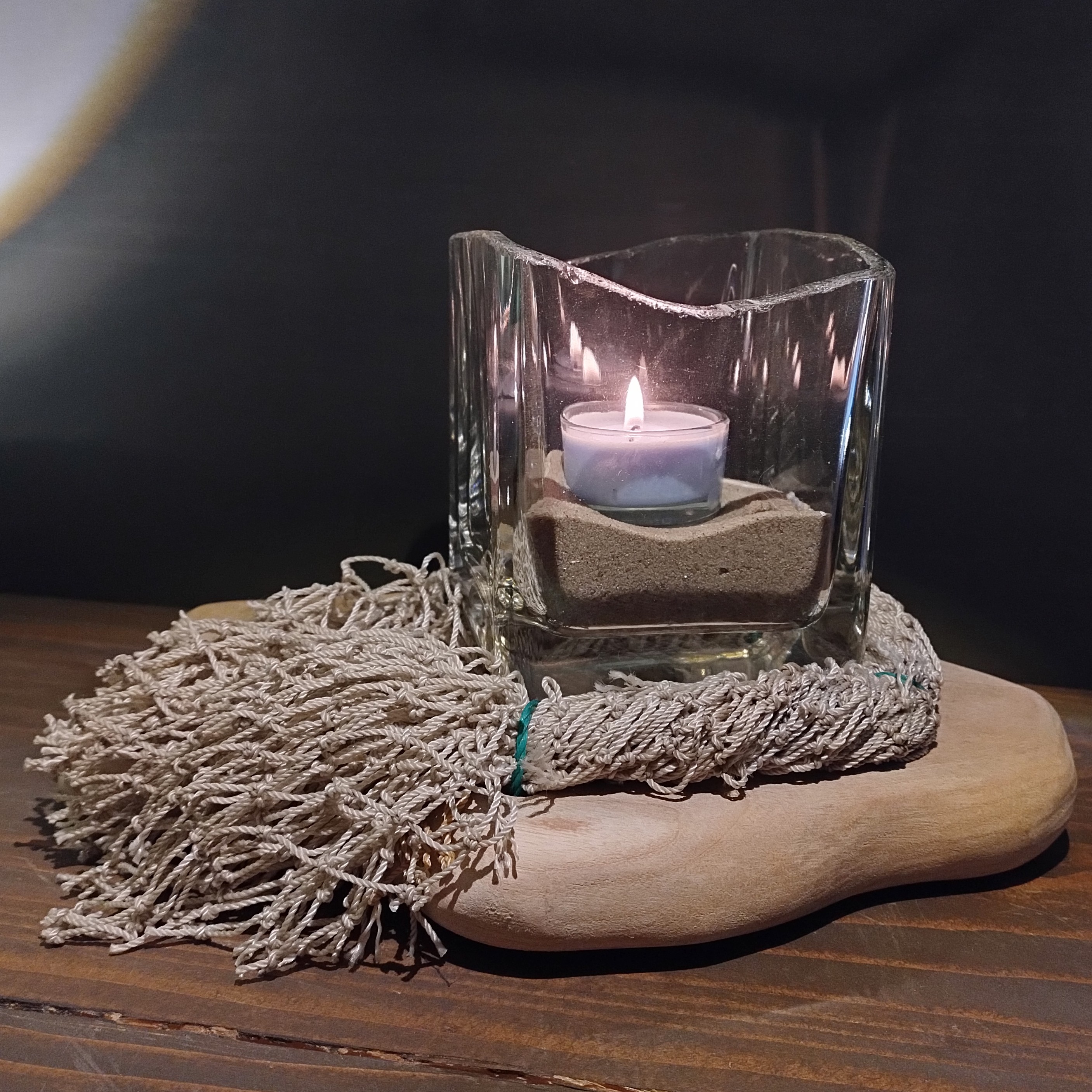 Alle Standteellichter wurden mit hellem Eichenholz, aus der Ostsee geborgenen Geisternetzen und upgecycelten Whiskey-, bzw. Ginflaschen mit Liebe in Handarbeit gefertigt. Keines gleicht dem anderen und es sind einzigartige Wohnaccessoires.