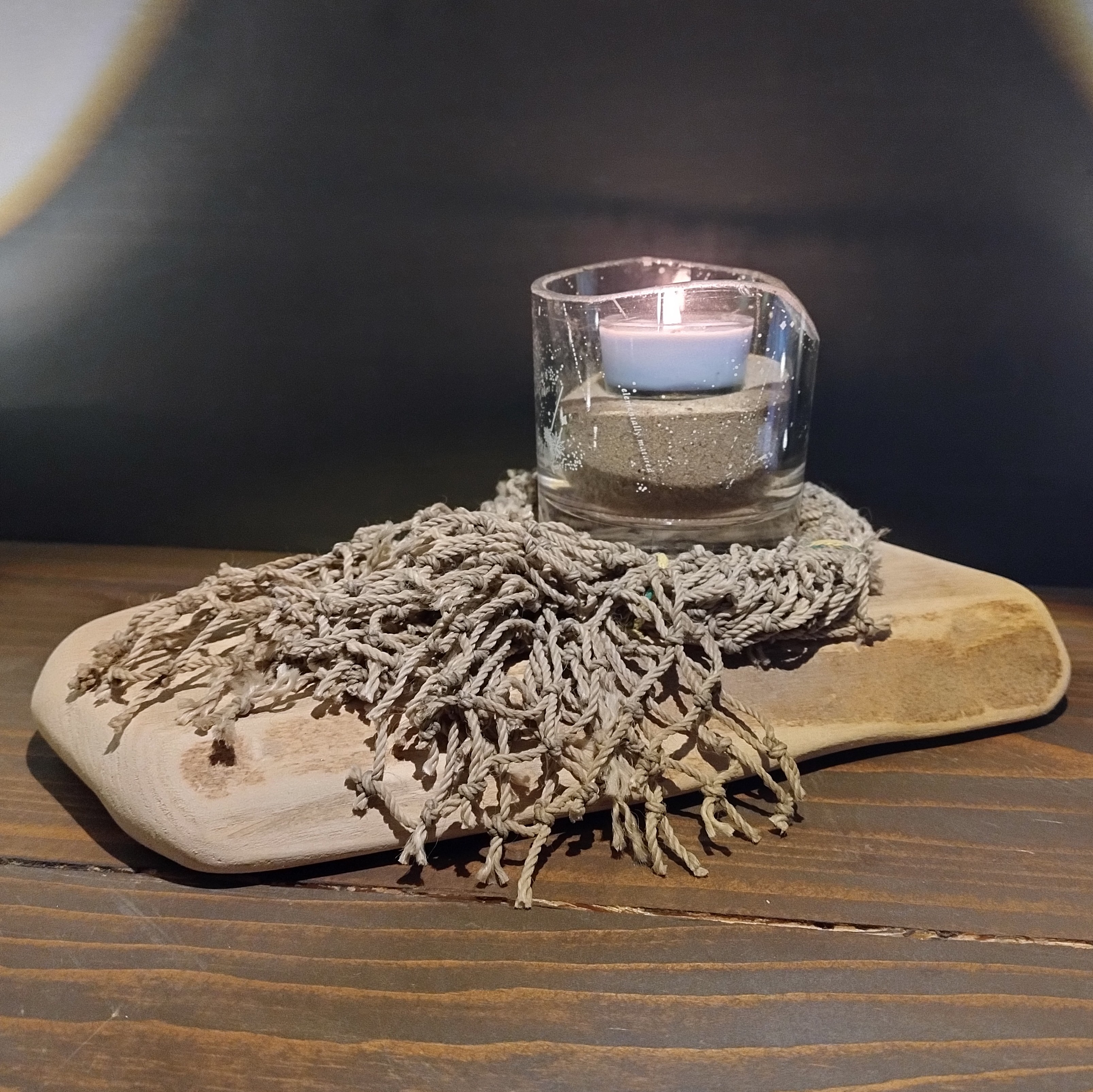 Alle Standteellichter wurden mit hellem Eichenholz, aus der Ostsee geborgenen Geisternetzen und upgecycelten Whiskey-, bzw. Ginflaschen mit Liebe in Handarbeit gefertigt. Keines gleicht dem anderen und es sind einzigartige Wohnaccessoires.