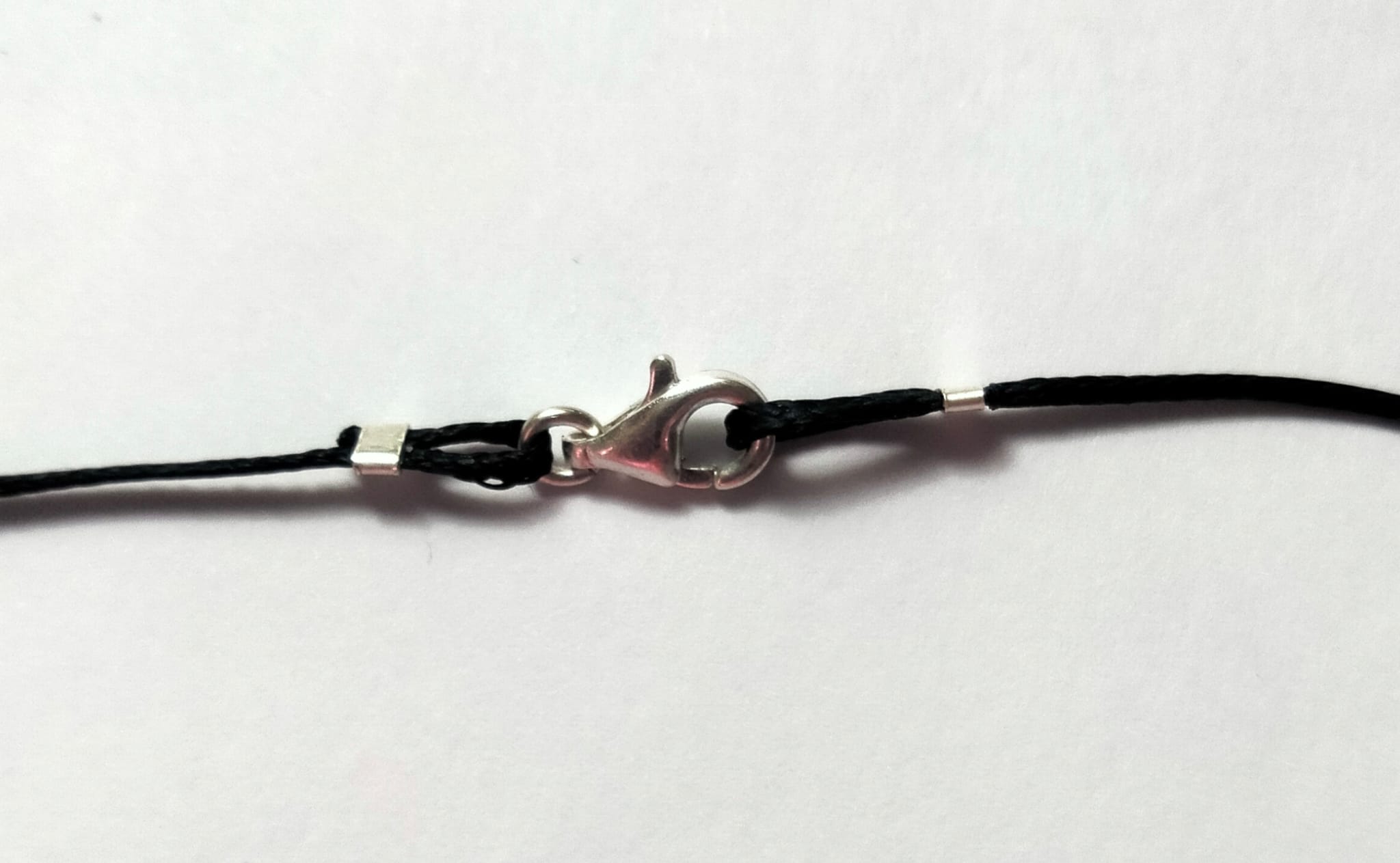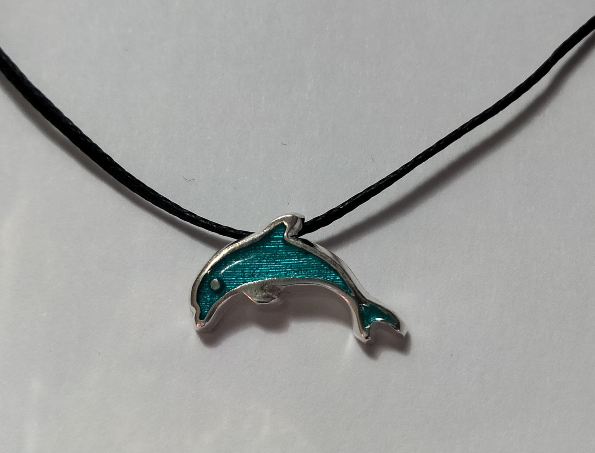 Handgemachte Kette mit einem schwarzen Band (gewachste Baumwolle) und einem Echtsilber (925er) Delfin mit türkisfarbener Füllung.