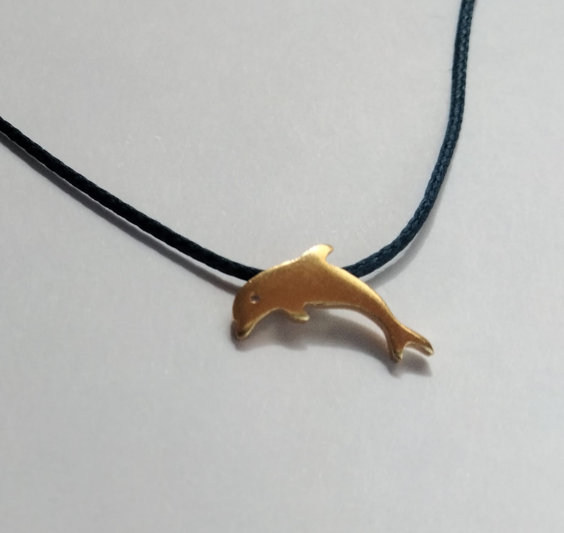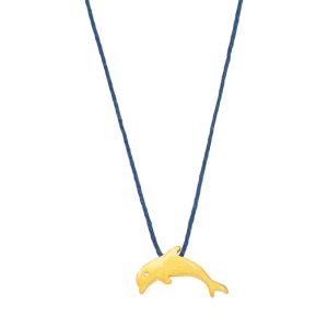 Handgemachte Kette mit einem dunkelblauen Band (gewachste Baumwolle) mit einem vergoldeten Delfinanhänger.